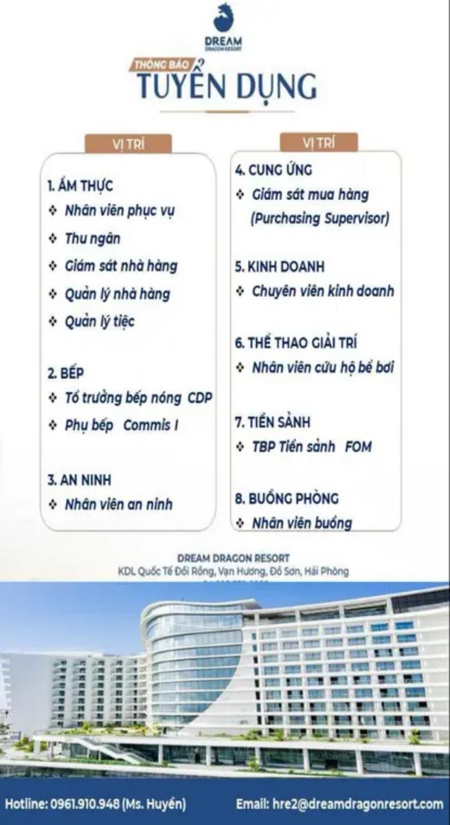 Khách sạn 5* Dream Dragon Resort Đồ Sơn, địa chỉ: Vạn Hương, Đồ Sơn, Hải Phòng cần tuyển nhân sự các vị trí ẩm thực, nhà hàng, tiền sảnh, bếp, kinh doanh... Đơn vị tuyển dụng Khách sạn 5* Dream Dragon Resort Đồ Sơn