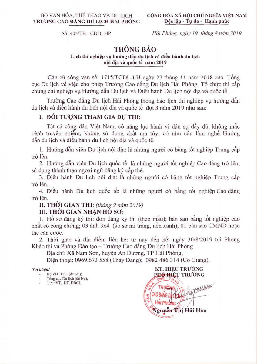 Trường Cao đẳng Du lịch Hải Phòng thông báo lịch thi nghiệp vụ hướng dẫn du lịch và điều hành du lịch nội địa quốc tế đợt 3 năm 2019.