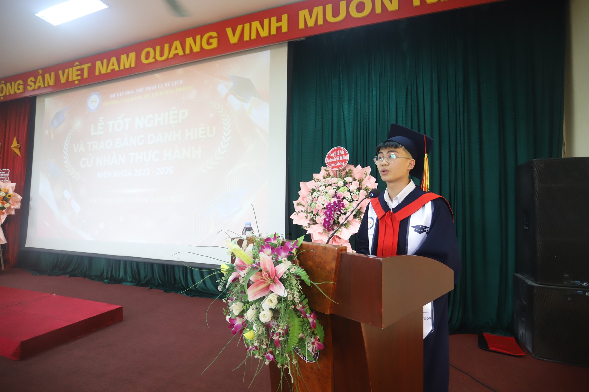 Đại diện cho các sinh viên tốt nghiệp, bạn Phạm Văn Nam- lớp Quản trị khách sạn CQK15A bày tỏ niềm xúc động khi nhìn lại chặng đường đã qua, từ những ngày đầu còn nhiều bỡ ngỡ đến khi trưởng thành với hành trang là tri thức, kỹ năng và những kỷ niệm đáng nhớ. Các sinh viên nhận định đã được đào tạo theo định hướng thực tiễn, gắn với tiêu chuẩn quốc tế. Mô hình học tập vừa học vừa làm giúp sinh viên nâng cao kỹ năng và thích ứng tốt với môi trường làm việc. Sinh viên cũng gửi lời tri ân sâu sắc đến quý thầy cô, những người đã tận tâm dìu dắt, truyền cảm hứng và đồng hành trong suốt quá trình học tập và rèn luyện.