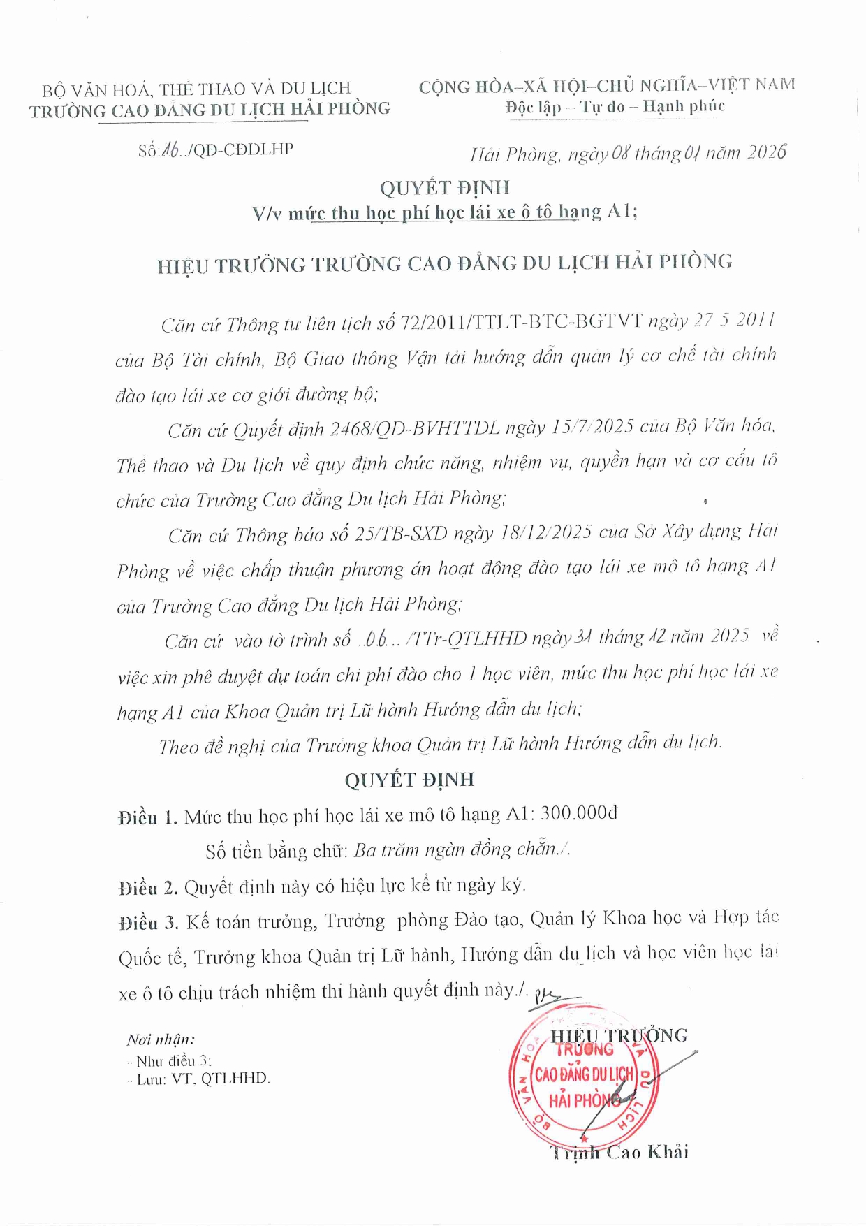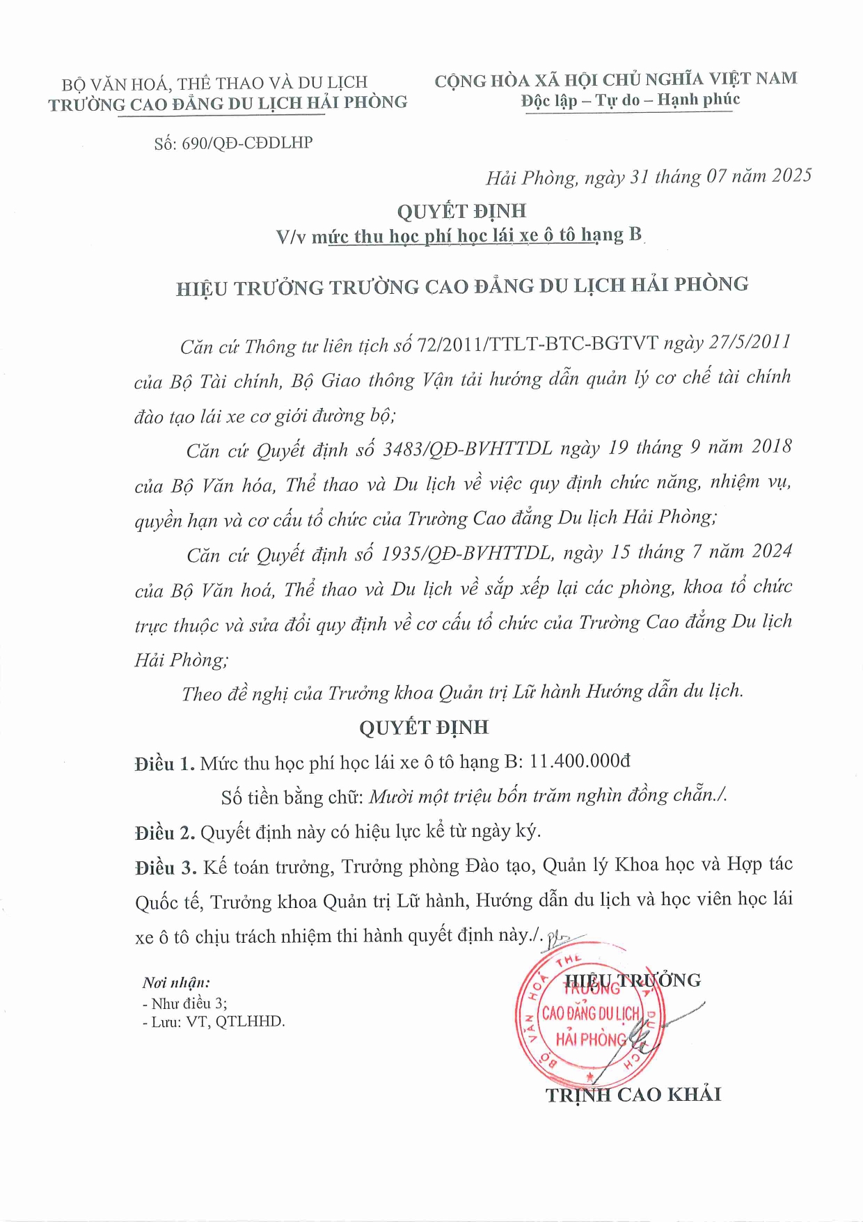 Quyết định mức thu học phí học lái xe oto hạng B, moto hạng A1