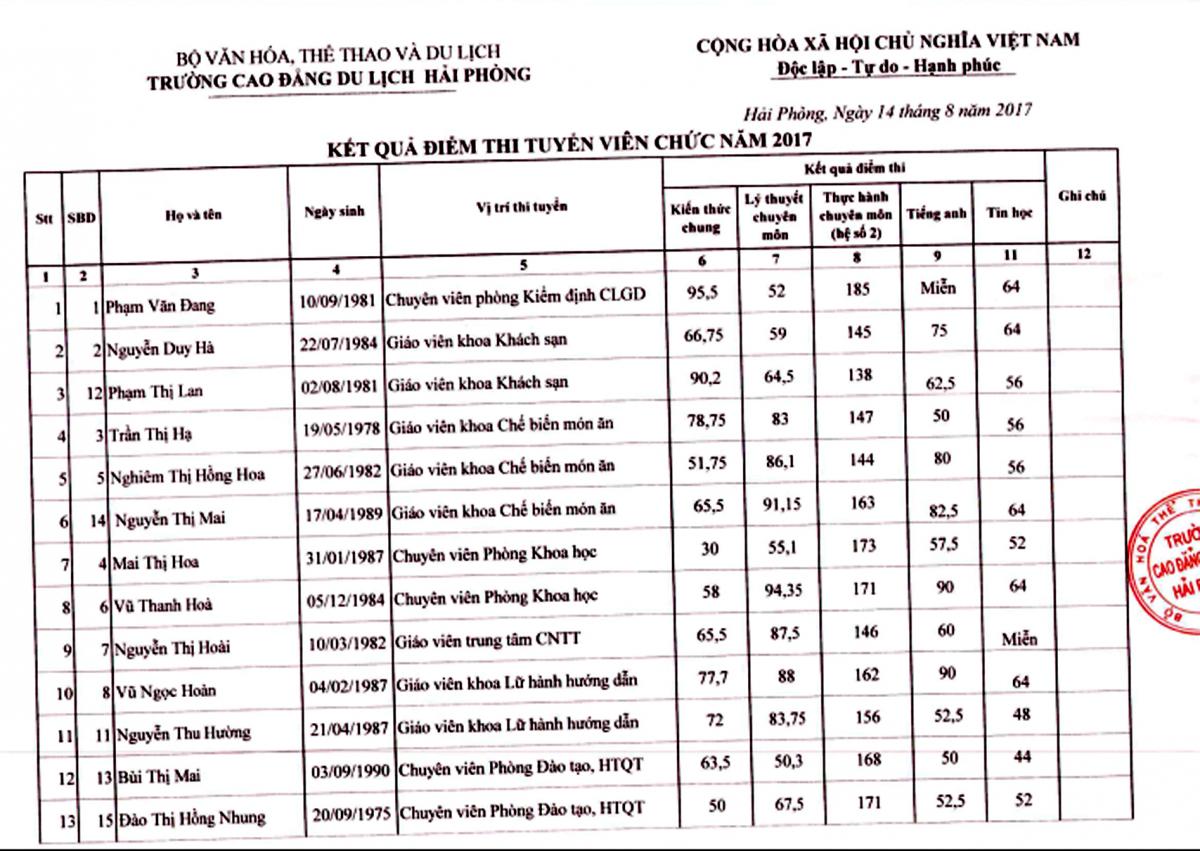 Ngày 9/8/2017, Trường Cao đẳng du lịch Hải phòng đã tổ chức đợt thi tuyển viên chức năm 2017. Với tinh thần làm việc nghiêm túc - trách nhiệm, các thành viên Hội đồng, Ban Giám sát, Ban coi thi của đã thực hiện đúng chức trách, nhiệm vụ được giao theo nội quy, quy chế đề ra, đảm bảo an toàn tuyệt đối trong thời gian thi.