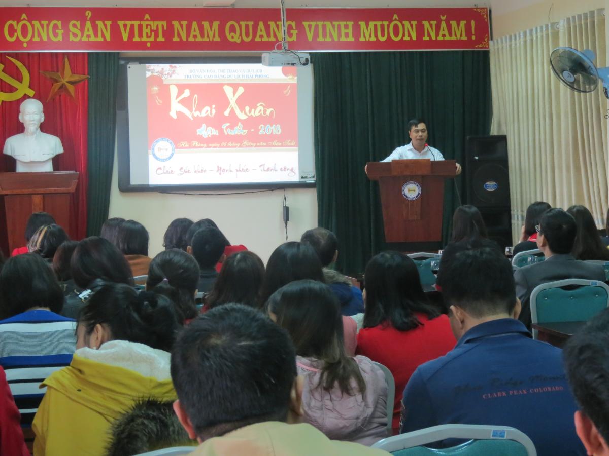 Nhằm động viên khích lệ người lao động sau kỳ nghỉ lễ dài và cũng để tạo khí thế cho một năm lao động mới. Sáng ngày 21/2/2018 tức 06 tháng giêng năm Mậu Tuất Trường Cao đẳng du lịch Hải Phòng đã tổ chức buổi lễ Khai xuân, Gặp mặt đầu năm. Buổi lễ là dịp để tập thể cán bộ giảng viên nhìn nhận lại hoạt động của năm 2018 và tiếp thêm khí thế động lực trong năm mới. Ghi nhận sự đóng góp của tập thể Cán bộ, giảng viên của Nhà trường trong năm 2017, nêu bật những cơ hội thách thức trong năm 2018 thay mặt Ban Giám hiệu – Hiệu Trưởng Phạm Văn Long đã gửi đến lời chúc mừng năm mới, mong muốn các tập thể và cá nhân phát huy hơn nữa tinh thần đoàn kết, chủ động, sáng tạo trong mọi mặt hoạt động công tác.