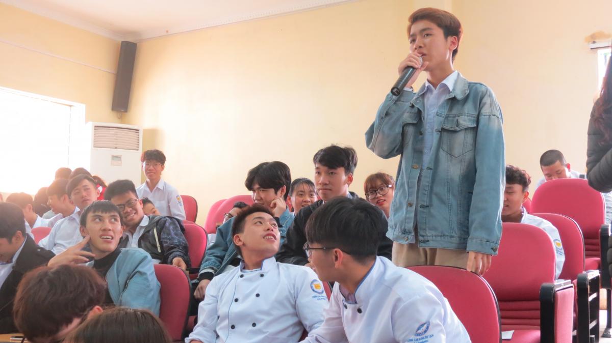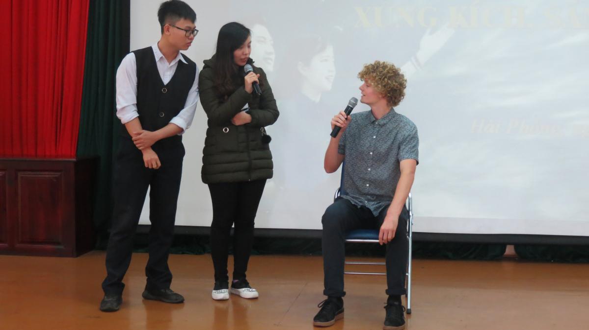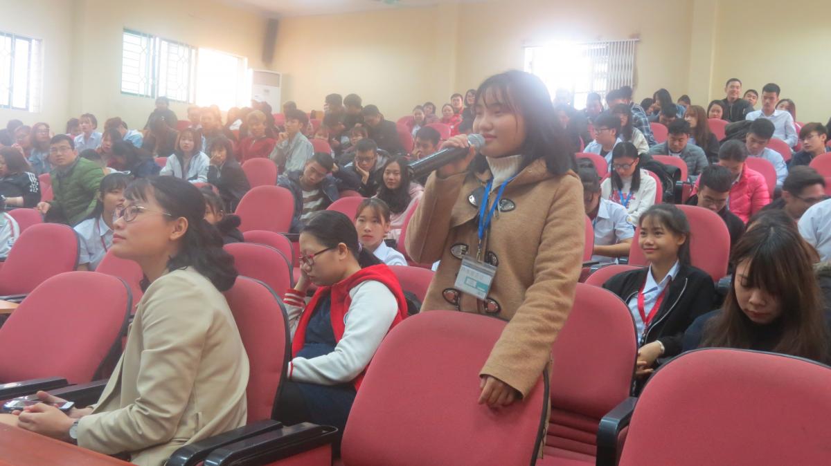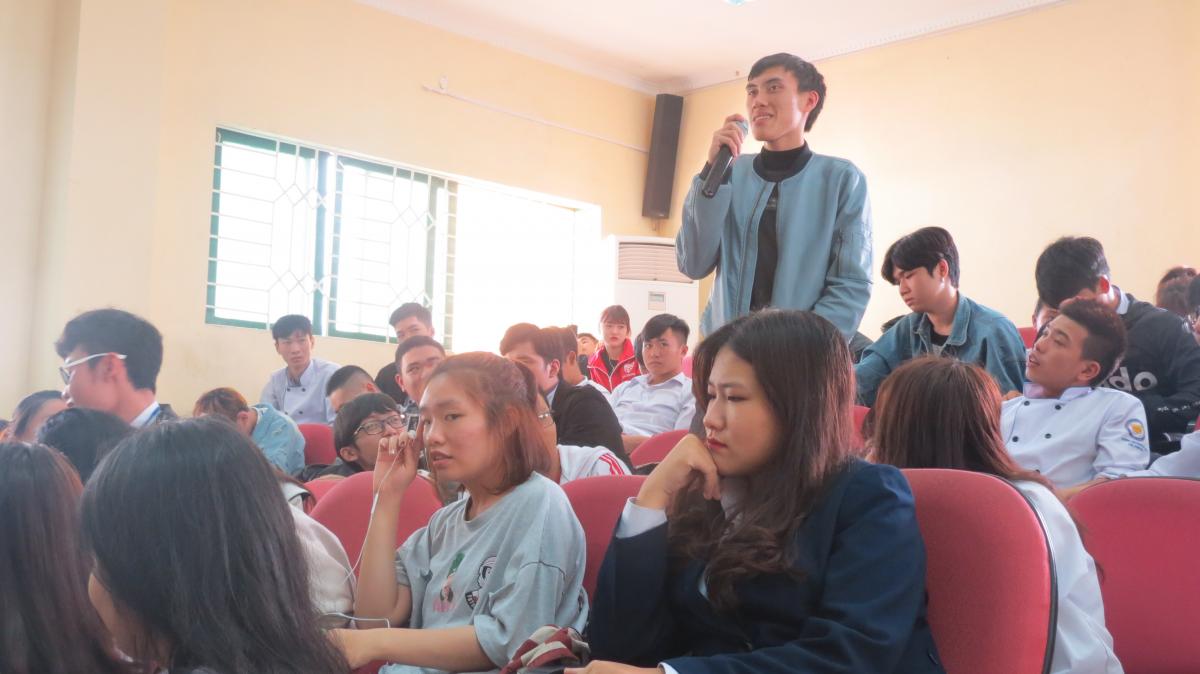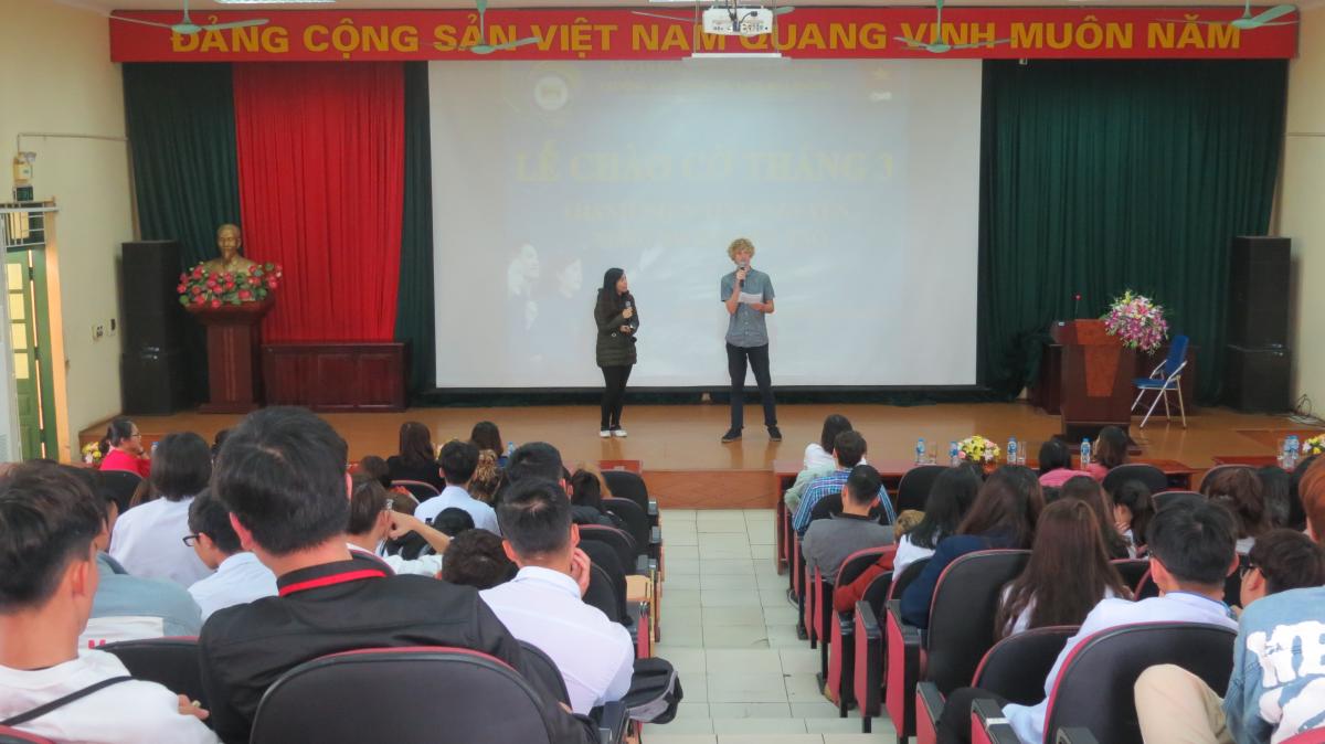 Điểm đặc biệt của buổi chào cờ tháng 3 năm nay chính là sự góp mặt của các tình nguyện viện đến từ nhiều nước khác nhau Như UC, Canada, Anh… Những trao đổi về kinh nghiệm học tập, những trải nghiệm bản ngữ của các tình nguyện viên đã làm nóng hội trường, rất nhiều ý kiến trao đổi chia sẽ và câu hỏi được đặt ra với các tình nguyện viên và tất cả được kết thúc bằng những tràng pháo tay cổ vũ của các bạn sinh viên.