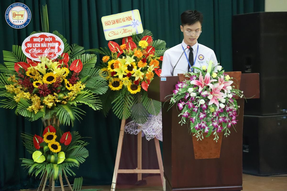 Đại diện cho các sinh viên trúng tuyển lớp Cao đẳng chất lượng cao cấp độ Quốc tế, em Võ Tiến Anh – tân sinh viên Lớp Quản trị khách sạn đã gửi lời cảm ơn sâu sắc tới BGH nhà trường, các thầy cô giáo. Với những điều tốt đẹp mà cha mẹ, nhà trường và xã hội dành cho chúng em, chúng em xin hứa sẽ nỗ lực hết sức mình, khắc phục khó khăn để xứng đáng với sự dìu dắt, chỉ bảo ân cần của các thầy cô giáo. Hơn thế nữa, sau này khi ra trường chúng em sẽ tiếp nối các thế hệ đi trước, góp phần viết tiếp trang truyền thống vẻ vang của Trường Cao đẳng Du lịch Hải Phòng, xứng đáng với sự tin tưởng và kì vọng của gia đình, thầy cô và xã hội.