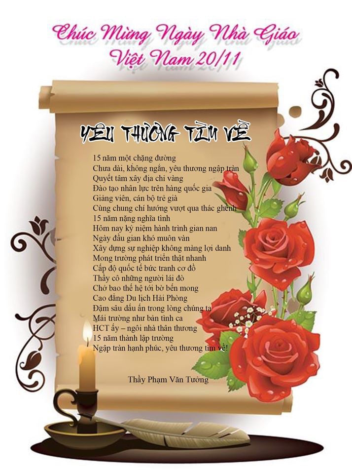 Tại lễ kỷ niệm “HCT’s Reunion – 15 years” và chào mừng ngày Nhà giáo Việt Nam, đại diện cho đội ngũ cán bộ, giảng viên, nhân viên nhà trường thầy Phạm Văn Tưởng - cán bộ Phòng Công tác HSSV đã nói lên những tình cảm từ trái tim mình đối với Trường Cao đẳng Du lịch Hải Phòng qua bài thơ : YÊU THƯƠNG TÌM VỀ