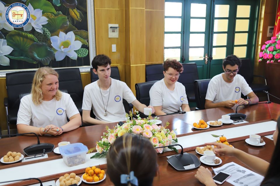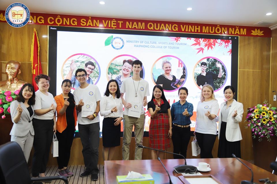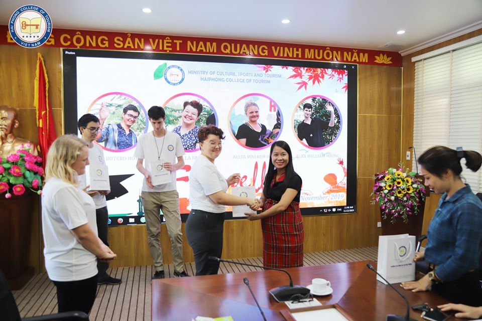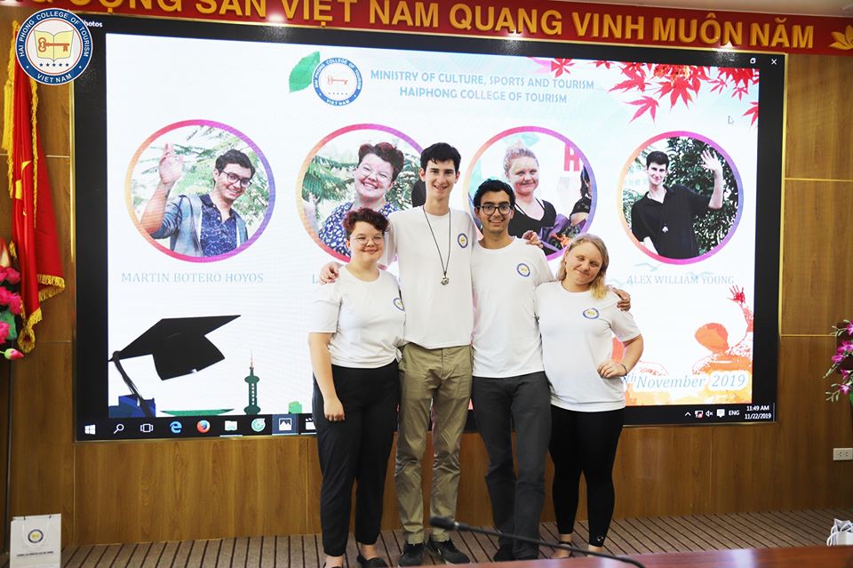 Sáng hôm nay, ngày 22/11/2018 Trường Cao đẳng Du lịch Hải Phòng đã tổ chức trao quà lưu niệm và chia tay với 4 tình nguyện viên (TNV) quốc tế là Alex William Young – đến từ New Zealand; Lucy Ella Farcnik – đến từ Canada; Aelya Walker Drew – đến từ Australia và Martin Botero Hoyos – đến từ Colombia sau hơn 3 tháng giảng dạy các khóa học Tiếng Anh giao tiếp cho sinh viên của nhà trường.