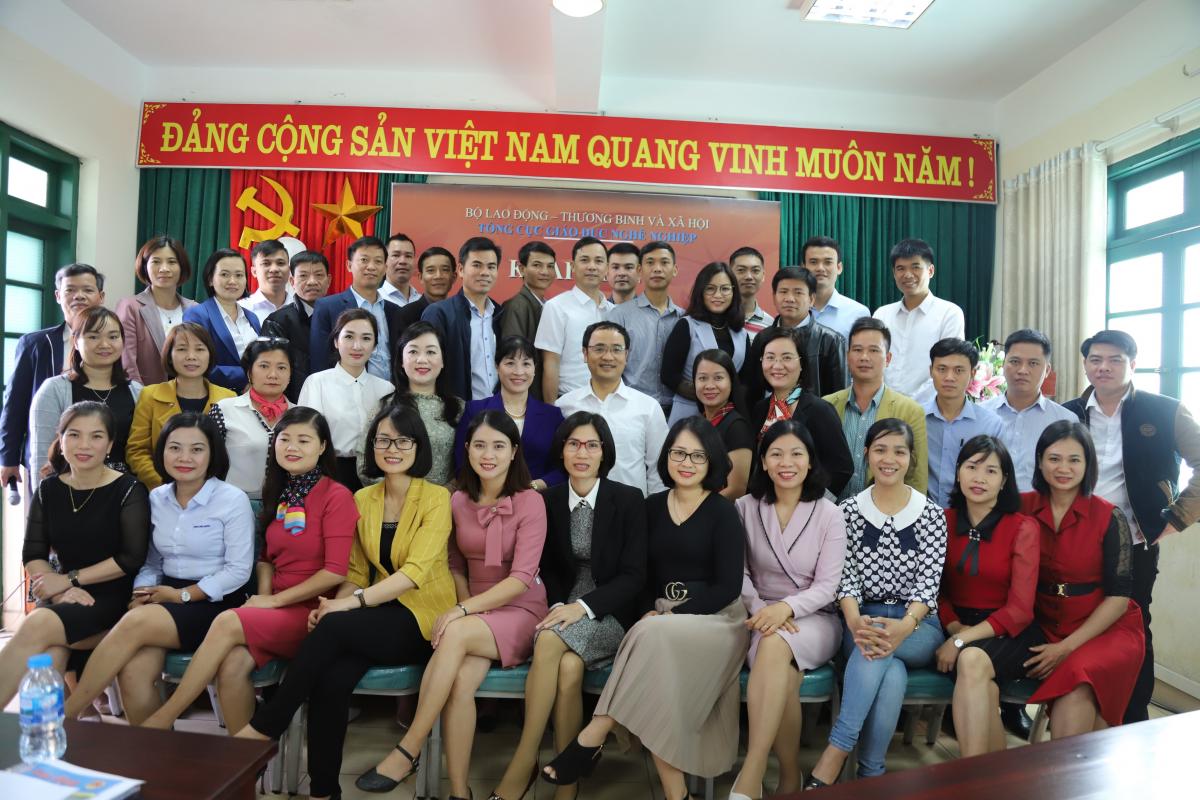 Các học viên chụp ảnh lưu niệm với lãnh đạo Vụ kỹ năng nghề, các chuyên gia và khách mời dự Khai giảng khóa đào tạo