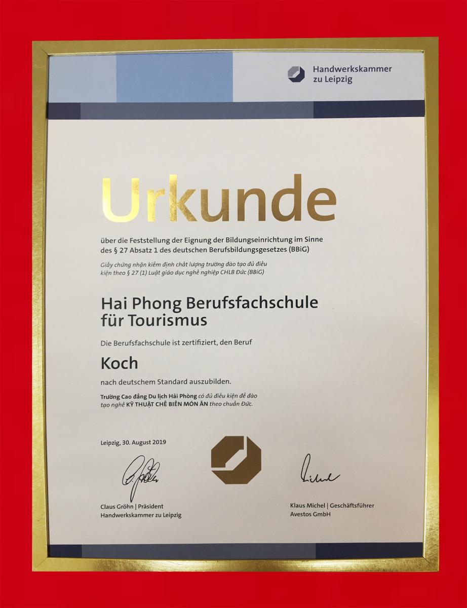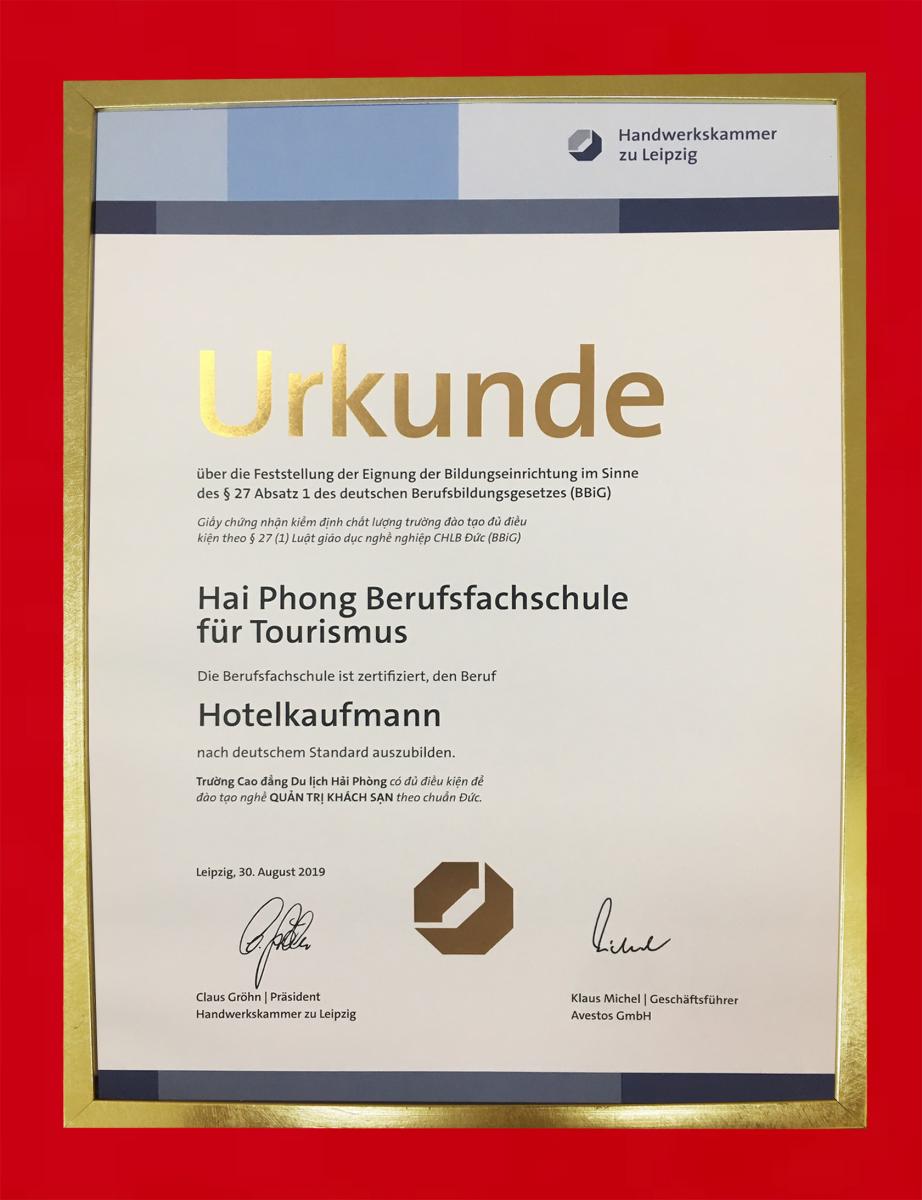 Chứng nhận kiểm định chất lượng Cao đẳng du lịch Hải Phòng đủ điều kiện đào tạo cấp độ quốc tế nghề Quản trị khách sạn theo chuẩn Đức