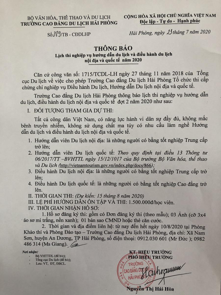 THÔNG BÁO: Lịch thi nghiệp vụ hướng dẫn du lịch và điều hành du lịch nội địa và quốc tế năm 2020