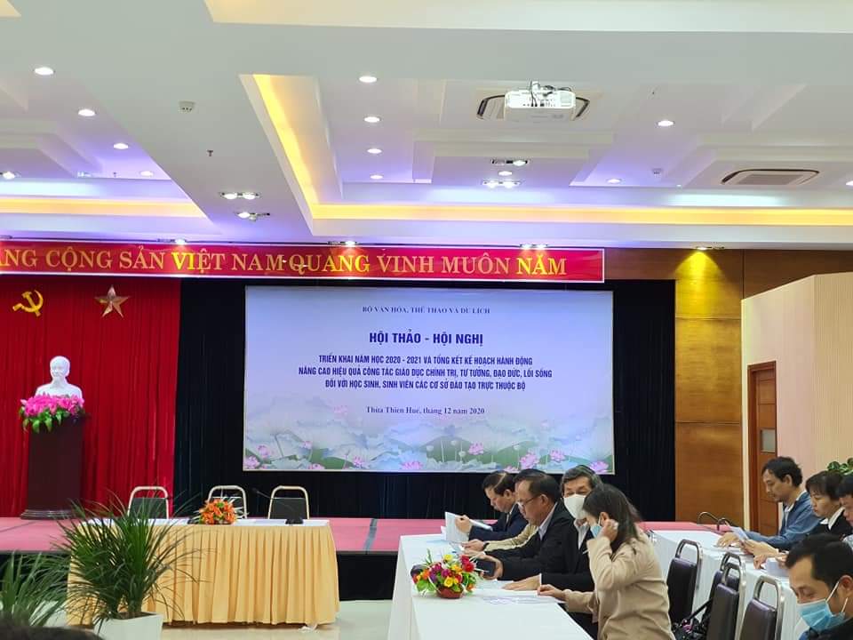 Ngày 18/12/2020 tại thành phố Huế, Bộ Văn hóa, Thể thao và Du lịch về tổ chức Hội thảo triển khai năm học 2020-2021 và Hội nghị tổng kết Kế hoạch hành động nâng cao hiệu quả công tác giáo dục chính trị, tư tưởng, đạo đức, lối sống đối với HSSV các cơ sở đào tạo trực thuộc Bộ gồm 26 đơn vị.