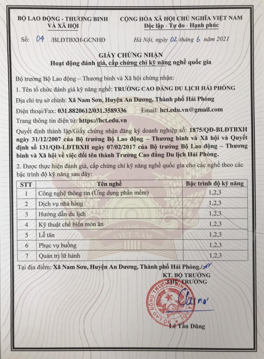Ngày 02-6-2021 Trường Cao đẳng Du lịch Hải Phòng vinh dự được Bộ Lao động - Thương Binh và Xã hội cấp giấy chứng nhận hoạt động đánh giá, cấp chứng chỉ kỹ năng nghề quốc gia theo các bậc trình độ kỹ năng 1,2,3 cho các nghề : Kỹ thuật chế biến món ăn, Hướng dẫn du lịch, Dịch vụ nhà hàng, Công nghệ thông tin (ứng dụng phần mềm), Lễ tân, Phục vụ buồng, Quản trị lữ hành.