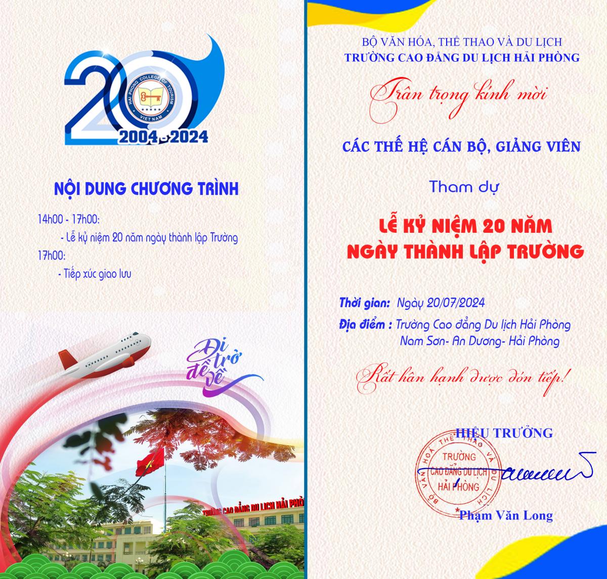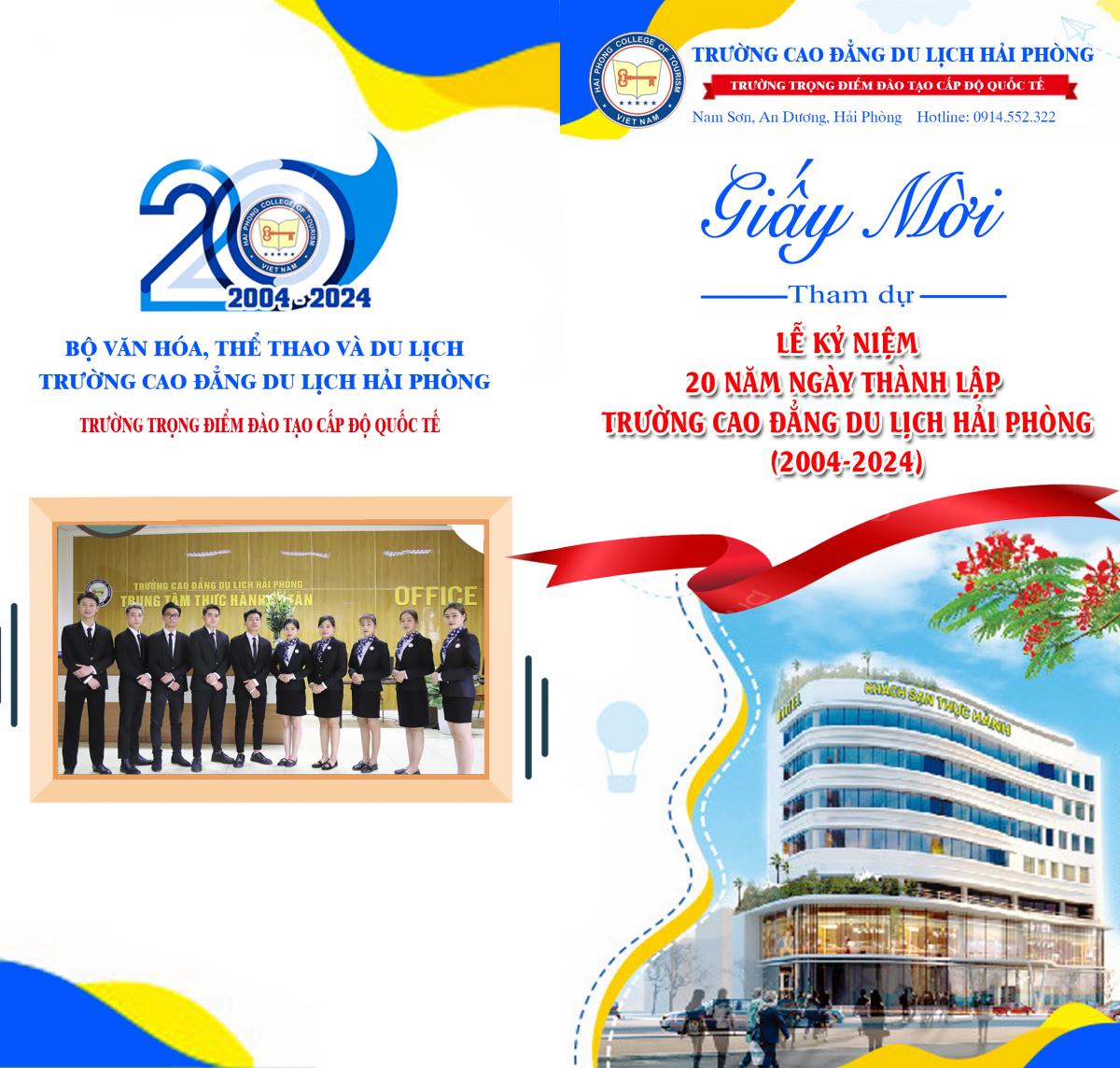 Chào mừng 20 năm thành lập Trường và thể hiện sự tri ân tới các thế hệ cán bộ, giảng viên; động viên khuyên khích Thầy và Trò Nhà trường có những đóng góp to lớn hơn nữa cho sự nghiệp giáo dục nghề nghiệp, Trường Cao đẳng Du lịch Hải Phòng tổ chức chương trình “Tiếp xúc và Lễ Kỷ niệm 20 năm thành lập Trường”. Nhà trường trân trọng kính mời các thế hệ cán bộ, giảng viên tựu chung về mái trường gặp gỡ các đồng nghiệp, bạn bè, học trò trong sự kiện đầy ý nghĩa và tình cảm này.
