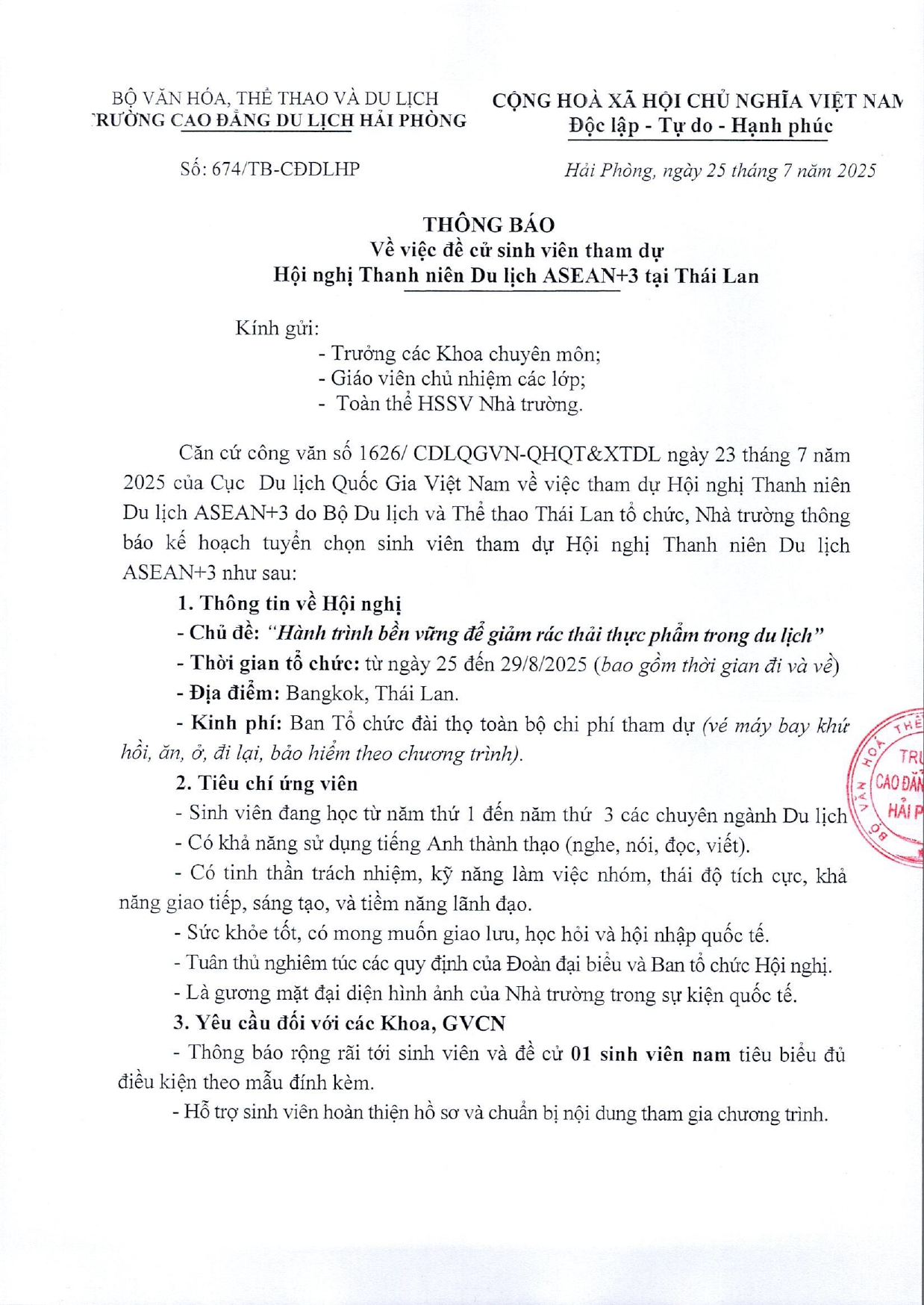 THÔNG BÁO ĐỀ CỬ SINH VIÊN THAM DỰ HỘI NGHỊ THANH NIÊN DU LỊCH ASEAN +3 TẠI THÁI LAN