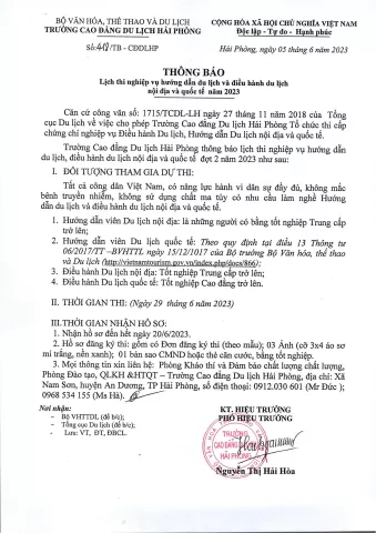 Ngày 23/7/2023 Trường Cao đẳng Du lịch Hải Phòng long trọng tổ chức Lễ khai mạc Hội giảng Nhà giáo GDNN cấp trường. Đây là sự kiện trọng đại chào mừng kỷ niệm 19 năm ngày thành lập Trường (23/7/2004-23/7/2023).