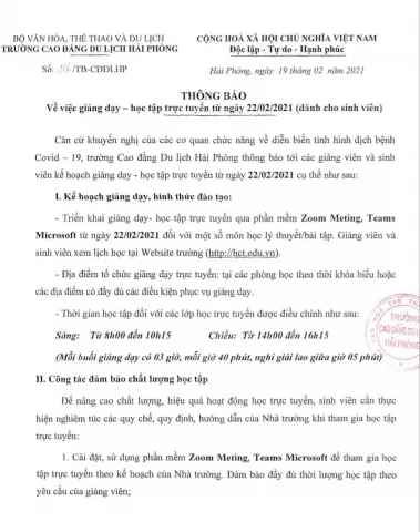 Trường Cao đẳng du lịch Hải Phòng thông báo tuyển sinh hệ cao đẳng, trung cấp chính quy, liên thông từ trung cấp lên cao đẳng năm 2021.