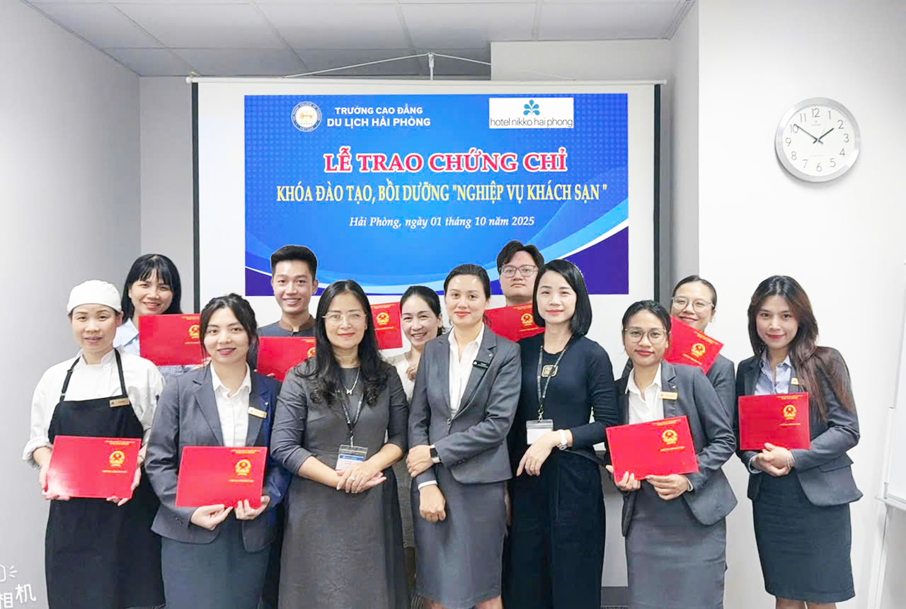 Ngày 01 tháng 10 năm 2025, Trường Cao đẳng Du lịch Hải Phòng phối hợp với Khách sạn Nikko – Công ty TNHH Chuo Việt Nam đã long trọng tổ chức Lễ trao chứng chỉ cho các học viên hoàn thành khóa đào tạo, bồi dưỡng “Nghiệp vụ Khách sạn”.